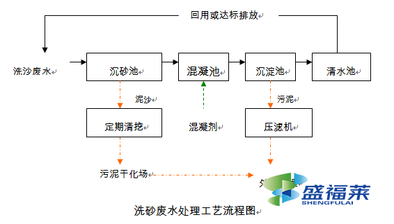 洗沙污水经排污沟进入沉砂池进行预处理,最长沉淀时间4小时,去除废水中的大颗粒泥沙等,出水自流至混凝池,此时投加混凝剂,将废水中的杂质聚集在一起并产生“矾花”,出水进入沉淀池,“矾花”被沉淀于池底部,池底污泥通过潜水泥浆泵定期清淤,沉淀池出水进入清水池,通过循环水泵回用或达标排放。